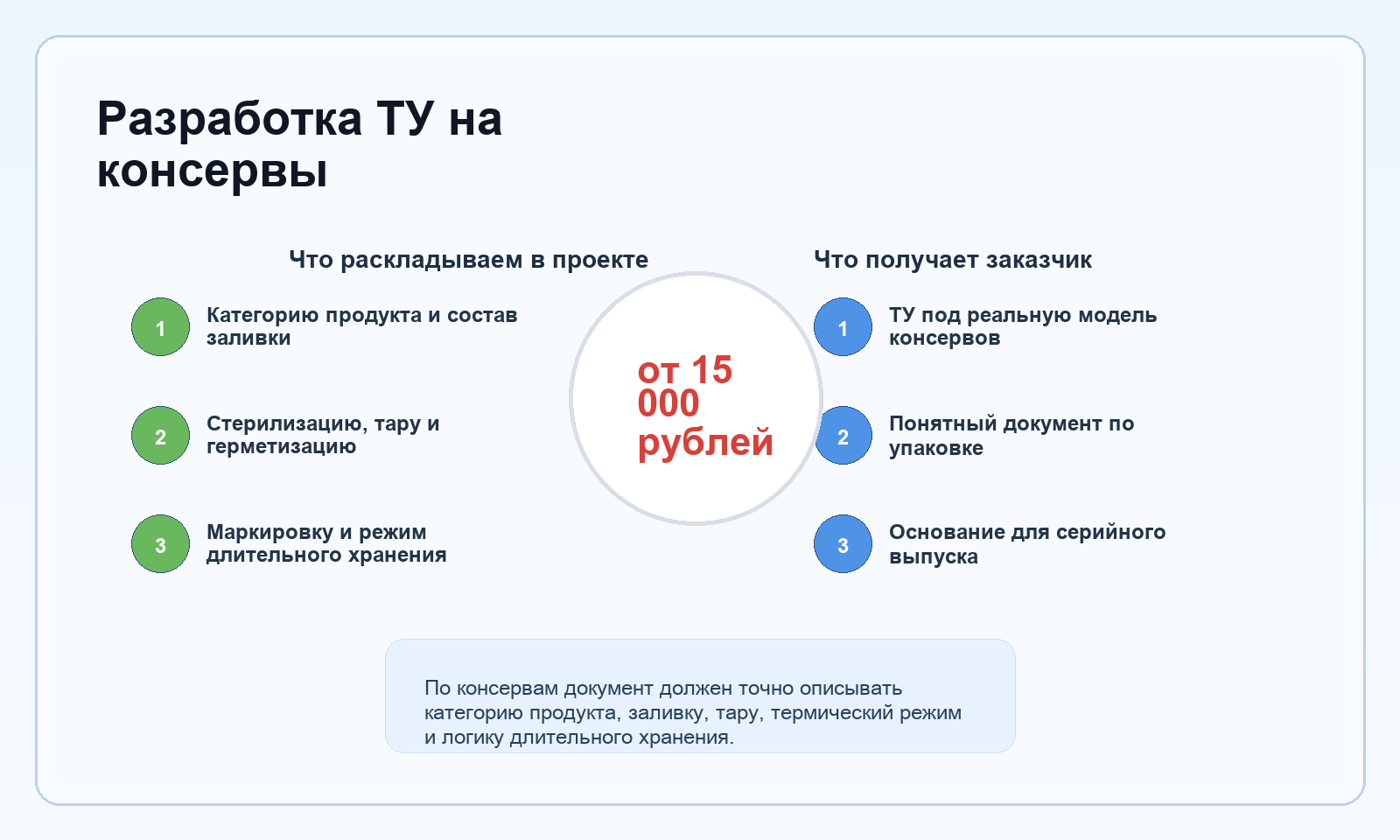 Подготовим технические условия на консервы с учетом состава, заливки, стерилизации, тары, длительного хранения и маркировки.