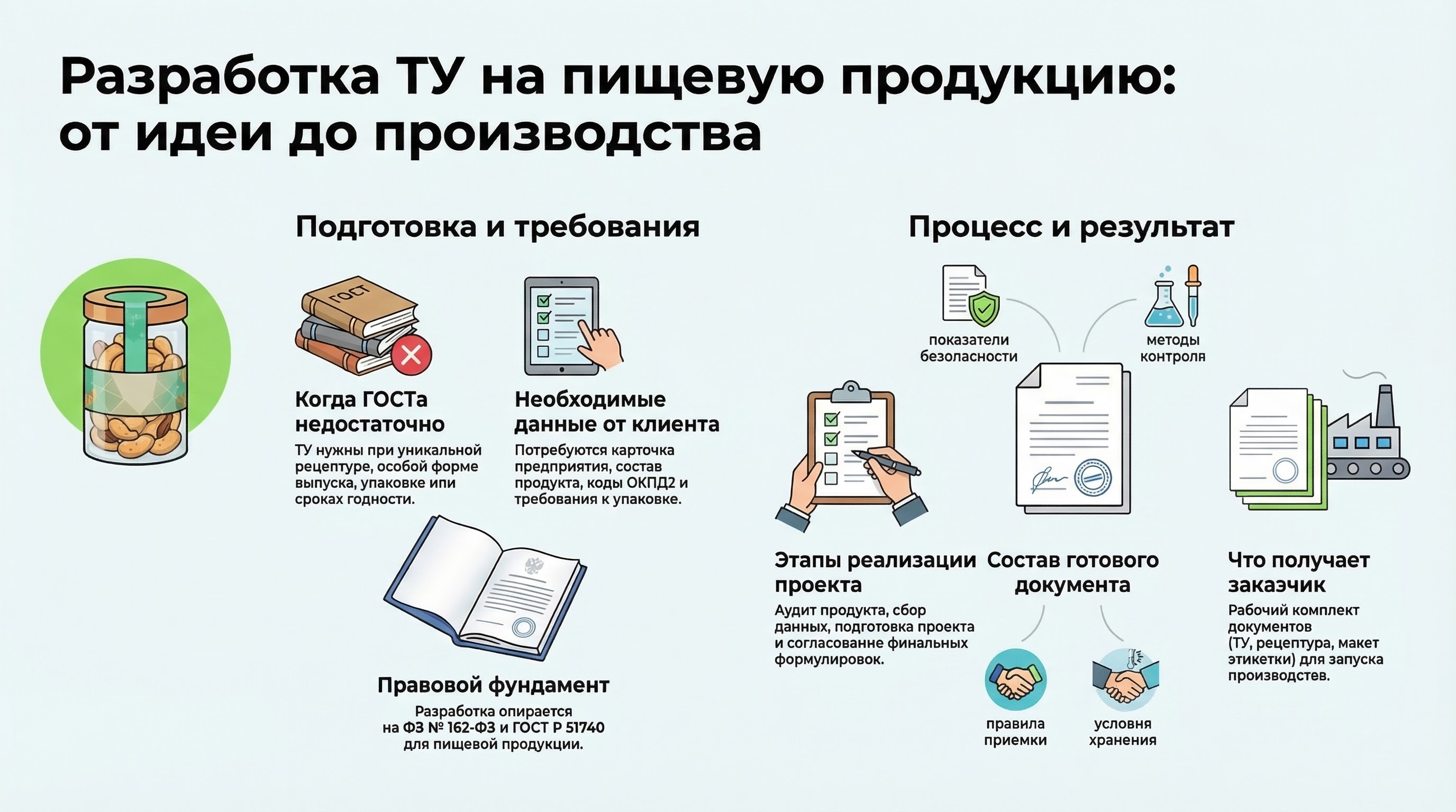 Технические условия на пищевую продукцию нужны не во всех случаях. Если для товара уже есть действующий стандарт и он полностью закрывает характеристики вашей продукции, отдельные технические условия могут не потребоваться. Но когда нужно закрепить собственную рецептуру, особые требования к упаковке, маркировке, контролю, хранению или сроку годности, технические условия становятся рабочей основой для выпуска продукции.